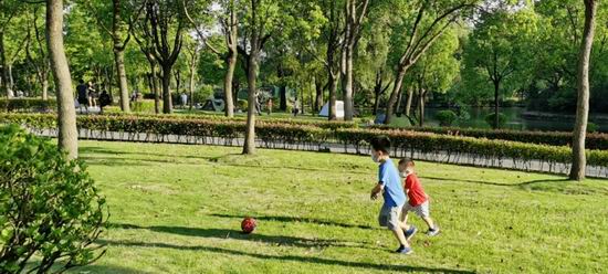 ▲徐娜的两个儿子在阳光下踢球,她刚怀上三胎。?.受访者供图