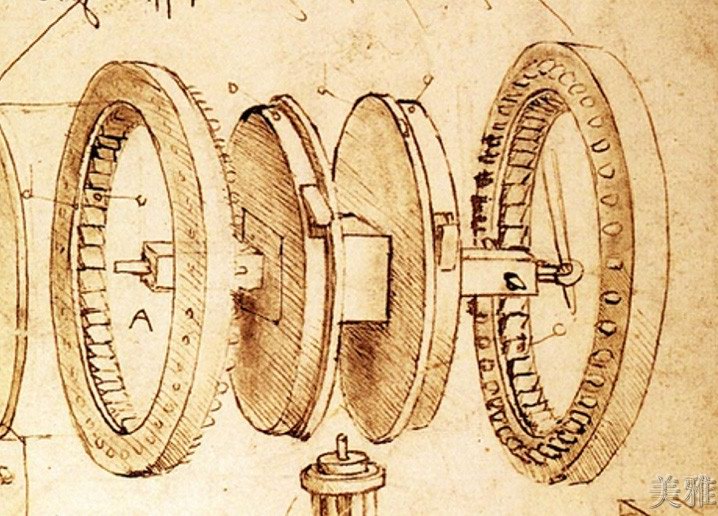 同时,达·芬奇还将弹簧巧妙地运用在了钟表设计上。后来大型钟表采用的原理,就是出自达·芬奇的设想。只是在这个设想中,弹簧的弹力被物体的重力所代替,物体向下的重力通过众多齿轮咬合作用被均匀传递,钟表便得以保持匀速运动。