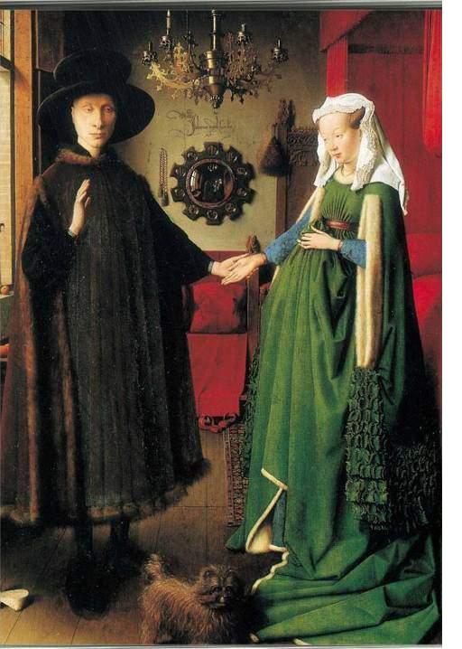 作为西方肖像画中最重要的作品《阿尔诺芬尼夫妇像》,以人物内在感情的形象化表达和肖像的情节性处理取胜。在这幅画中,主人公阿尔诺芬尼和他的妻子正在举行婚礼,生活环境的描绘,给人以虔诚和平的感觉,在某种意义上赞扬了当时的平民生活方式和道德观念。[/hide]