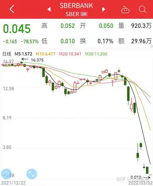 但是,在俄乌战争爆发之后,俄罗斯联邦储蓄银行股价开始暴跌,从最高点21.63元/股到3月2日跌到只剩0.045元/股,市值从1100亿美元跌到只剩2.43亿美元,也就是只剩点骨头渣了。