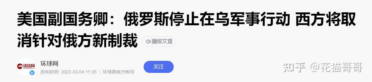3月4日,美国副国务卿公开宣布,如果俄罗斯从乌克兰停火撤军,那么西方将取消所有因为俄乌战争增加的制裁。