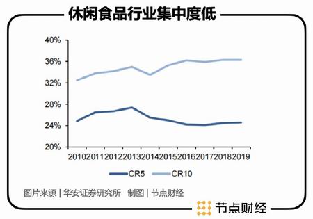 而头部企业并没有在市场上形成绝对的 “统治力”。据华安证券研究所数据,在 2010 到 2020 年,我国休闲零食行业 CR5 不增反降,2019 年仅为 24.6%,2020 年已下降至 23.0%。