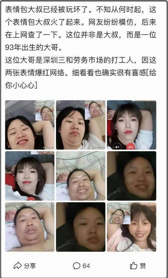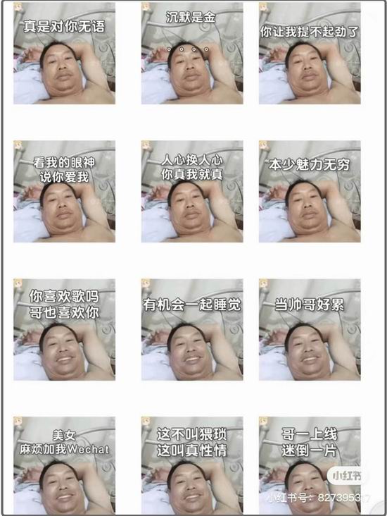 但被制作成表情包之后,这两张自拍开始被广泛传播,指数级增长的速度,让大叔迅速成为了.新晋表情包顶流,摆烂先锋以及猥琐代名词。