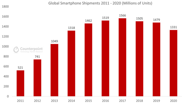变化在 2018 年时已开始显现。根据市场调研机构 Counterpoint 数据,全球智能手机的出货量自 2017 年达到 15.66 亿台的高点后,出现了连续三年的下跌,到 2020 年,全球智能手机的出货量已低至 13.31 亿部,几乎与 2014 年的智能手机市场持平。