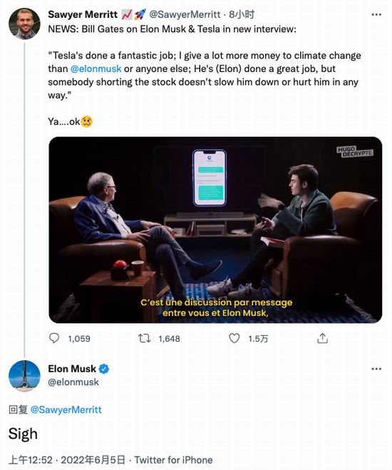 马斯克随后在报道盖茨这一采访的推文下回复称:“哎!”。