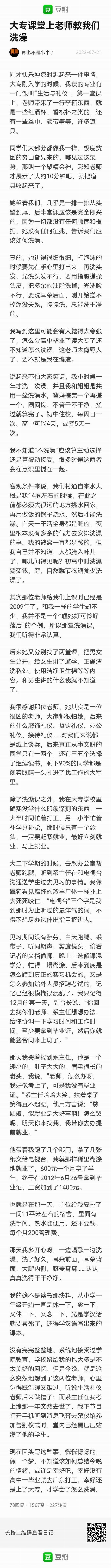@再也不是小牛了:同学们大部分都像我一样,极度贫困的穷山旮旯来的,已经是 2009 年了,和我一样的学生却不少。“生活与礼仪” 的老师第一堂课,后半堂应该是完全即兴的,因为一切都没有任何顺序和根据,她没有任何征兆,告诉我们应该如何洗澡。