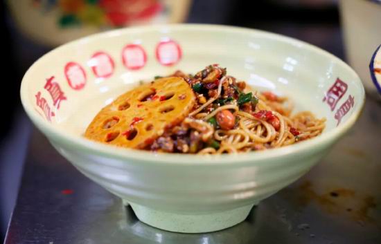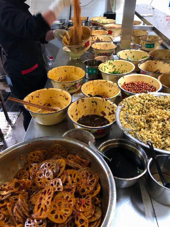 如今在当年开的第一家老店里,杨真依然每天负责拌粉。米粉从煮锅里捞出,还在冒烟,趁热放在搪瓷深碗里开始搅拌,酱油、榨菜、花生米,先搅拌一阵,然后再放入鲜椒酱、辣椒油,再继续搅拌。拌的时候很讲究技法,需要用筷子夹住粉上下来回挑,将所有汤汁包裹在粉上。全都拌好了,最后再放上香菜、辣藕片和辣卤牛肉。