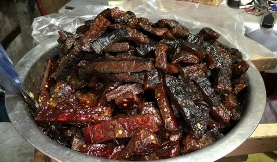 辣椒饼也许可以被称为辣条的鼻祖,所谓辣椒饼,就是和面时在面粉里掺入辣椒末,再加入一点盐和油,压成饼去蒸,蒸好后切成小块。这在当年学生们中是与辣藕片一样最受欢迎的零食,褐色的辣椒饼如今尝起来并没有什么特殊,辣辣的,有点咸,一种面饼的口感。毛嫂说如今依然有孩子来买辣椒饼,但因为制作麻烦,整个万寿宫街区只有四个人还在坚持卖。显然,随着越来越多零食的出现,辣椒饼已经接近于被时代淘汰的临界点了,它代表着物资匮乏时期南昌人的嗜辣传统。
