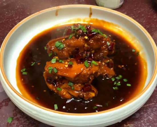 烧鸡翅是店里最主打的一道菜。鸡翅会先被放在干辣椒末里反复揉搓入味,然后再用酱油和辣椒红烧,一道典型的红烧菜,但当老板娘端上餐桌时,我却立马发现其中有些不对劲:鸡翅一个个横着摆于盘中,被摆成了一个三角塔尖,但看不见辣椒籽,也看不见辣椒段,盘子里的红烧汤呈现出一种非常非常深的暗红色。两室一厅的馆子往往环境简陋,这里有点漏风,于是我进餐厅后并没有脱下羽绒服外套和毛线帽子,但当我吃下第一口后,就感觉整个天灵盖上头有一团火,从脑门开始冒,冒到了天灵盖,直接冲破了我的毛线帽子,当然,这还只是我吃第一根鸡翅的感觉。
