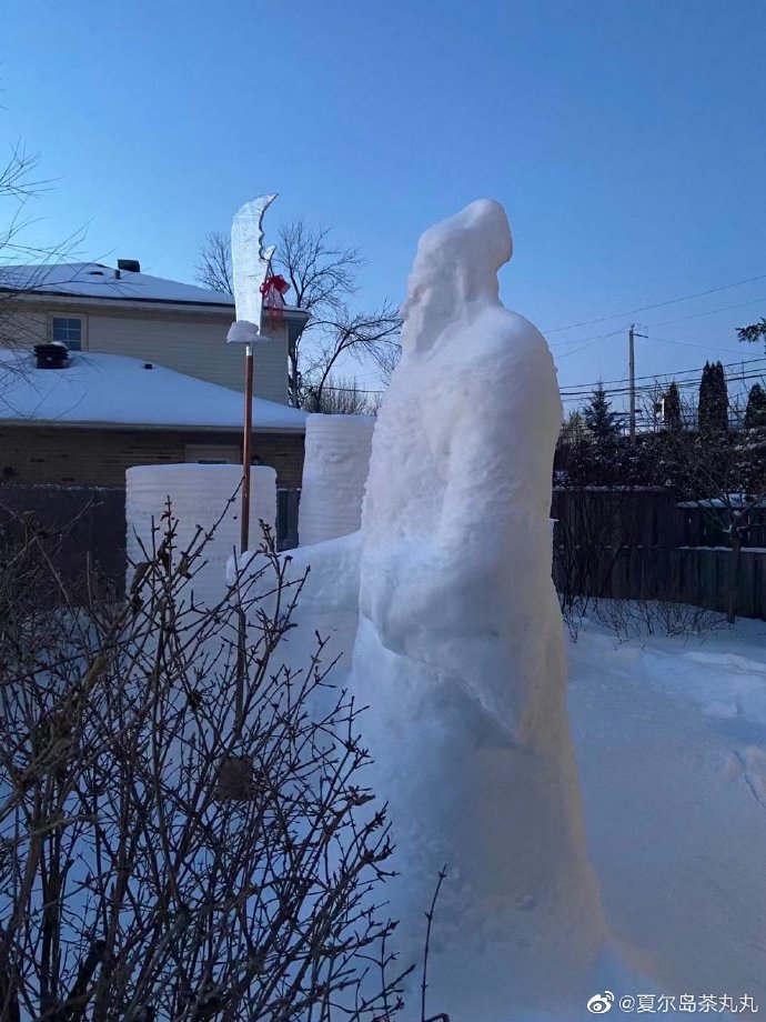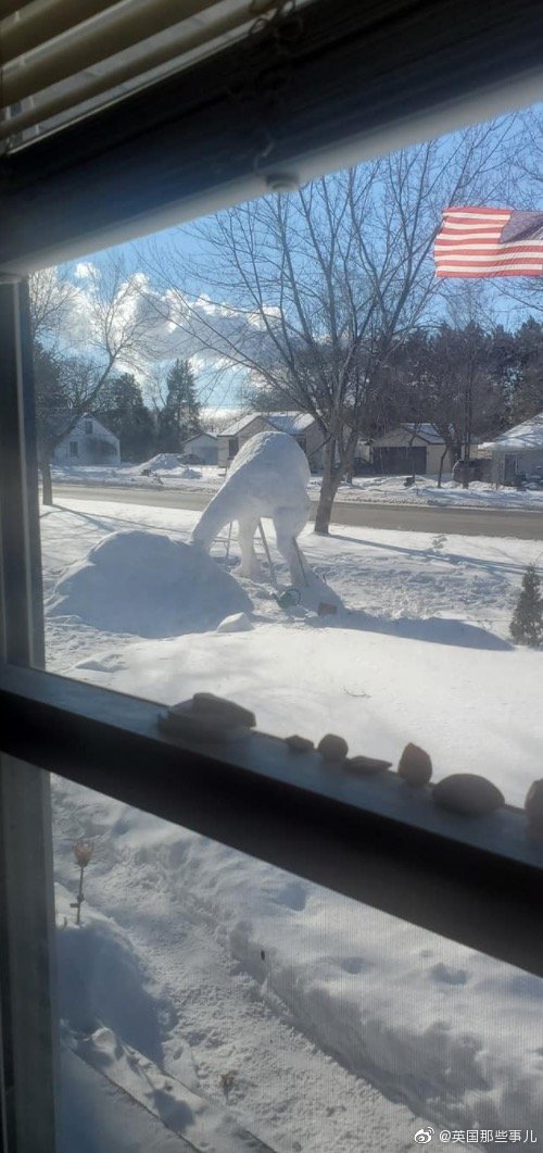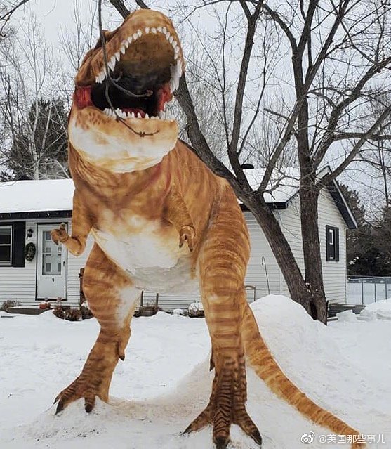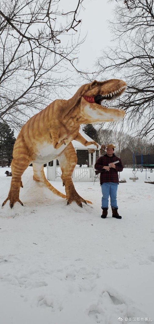 @英国那些事儿:明尼苏达州一位老哥 Paul Larcom,在自家前院用积雪堆出了一只霸王龙!…… 老哥不仅给它喷上了栩栩如生的颜色,牙齿也是一颗一颗捏出来的…… 据称他总共花了大概 170 个小时才完成,也是厉害了。