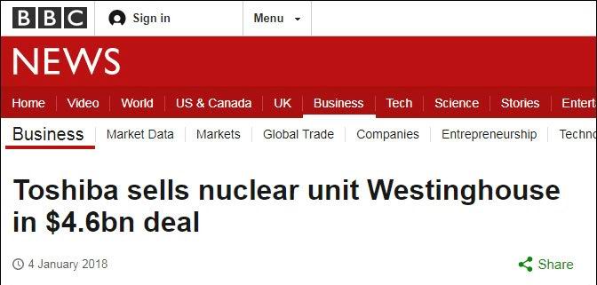 于是,东芝的核电事业在.2017.年再度受挫,继续亏损上百亿美元。年终总结一盘,东芝资不抵债,面临退市。