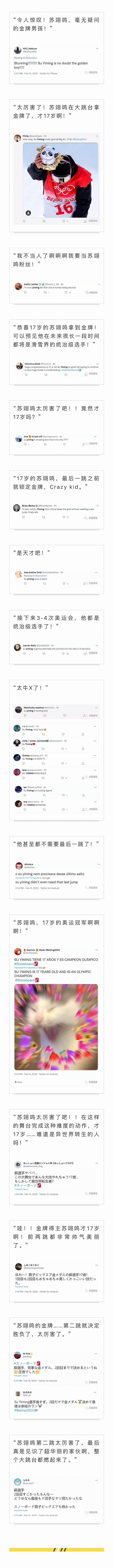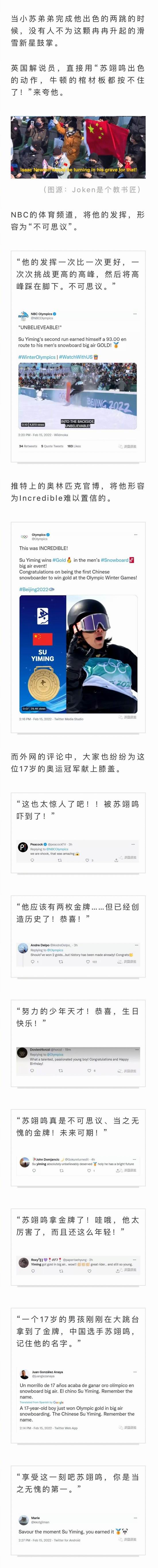 推特上面网友夸爆了,各种语言惊叹小苏牛 X。不过说真的,退出娱乐圈息影训练,18 岁没到就拿到奥运金牌,爽文男主都不敢这么写吧