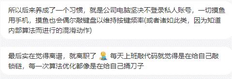只不过最后呀,这位爆料老哥还是选择了离职,用他自己的话说:每天上班敲代码就像是给自己带枷锁,每一次的算法优化都像是在给自己捅刀子。