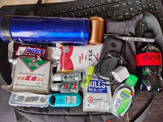@蘸盐: 我现在出门都是挎个包,里面装上充电宝,充电线,插头,一个保温杯,一小盒茶叶,两块士力架,一包压缩饼干,一包牙线,小瓶漱口水,湿厕纸,消毒凝胶,外套里边多穿件坎肩(万一隔离了铺着盖着都行)