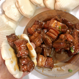 说完抓起桌子上的馒头,用刀竖切开两片,夹起几块红烧肉放在中间,完美闭合,然后递给我:「给,这就是汉堡」