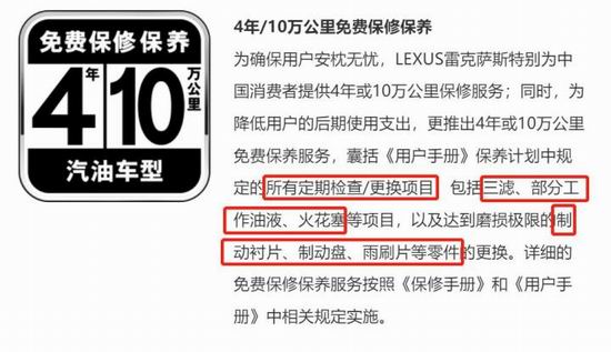 人家雷克萨斯免费保养期限虽然只有 4 年 /10 万公里,但包含的项目更实在,随车手册上要求的定期保养项目一律免费,而且免工时费。除了不包免费换轮胎,别的都包。