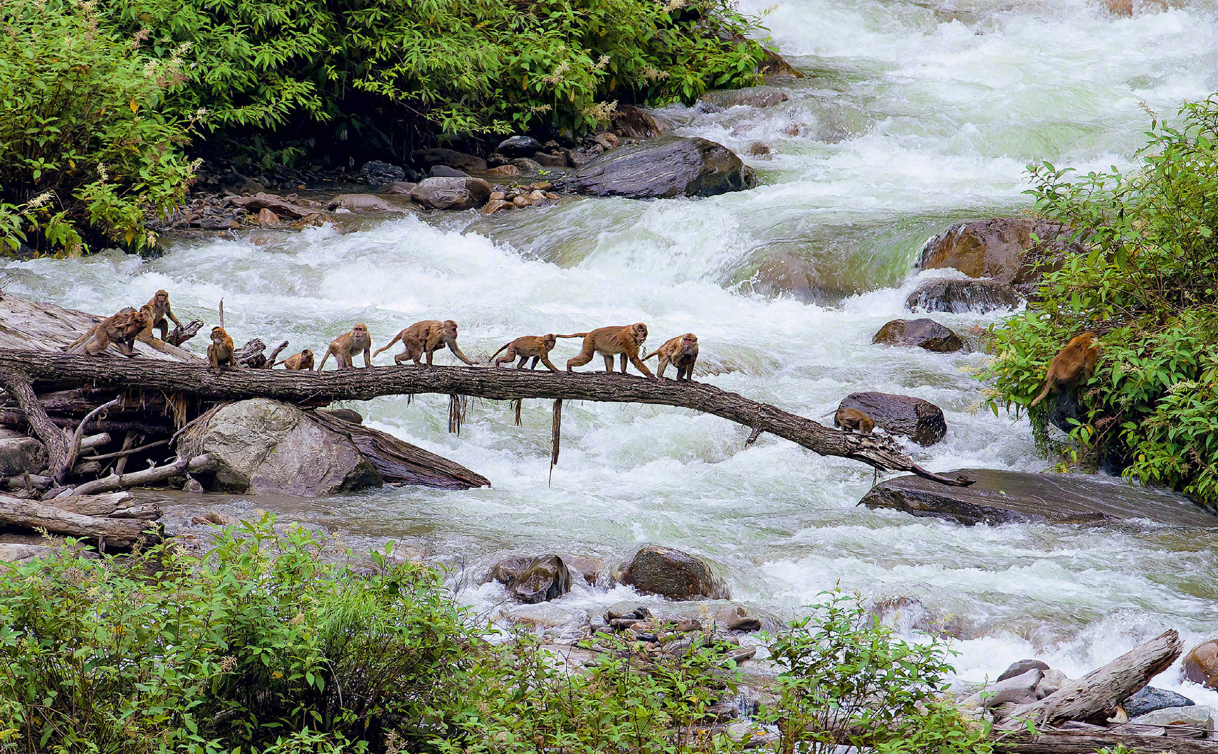 在我国与尼泊尔的一段界河上,一群熊猴从一棵倒掉的大树形成的独木桥上排队渡河,从尼泊尔进入我国境内。来数数图上有几只猴
