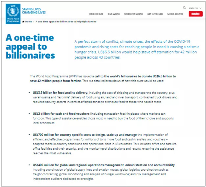 世界粮食总署催捐马斯克的事有进展了,马斯克说要一份如何花掉 66 亿善款的方案,然后他们真的就在官网上给了。