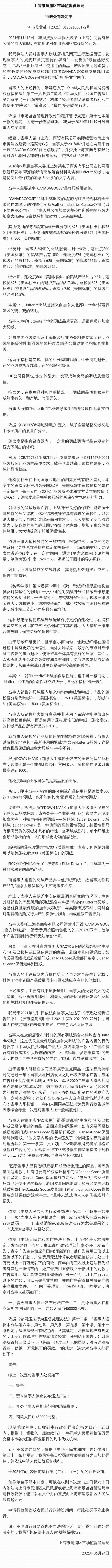 上海这份处罚决定书简直是羽绒服购买指南