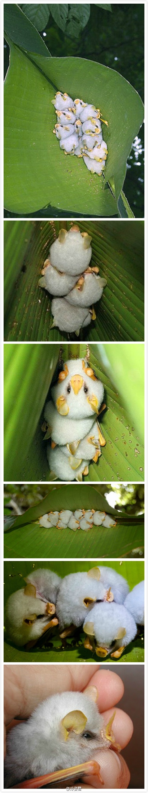 #你知道么# 这是分布于中美洲的洪都拉斯白蝙蝠,体长只有 3 到 5 厘米,群居在芭蕉或者香蕉的叶子上,小家伙们主要以吃果子为生 (不吸人血),雪白的毛让它们远看起来像是一堆小汤圆儿,应该是世界上最萌的蝙蝠了吧。 (@冷姿君)