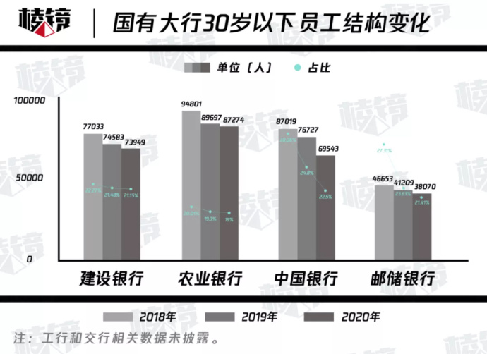 《棱镜》作者整理几家国有大行近三年的员工年龄结构数据发现,30 岁以下的员工人数、占比均在加速下滑。