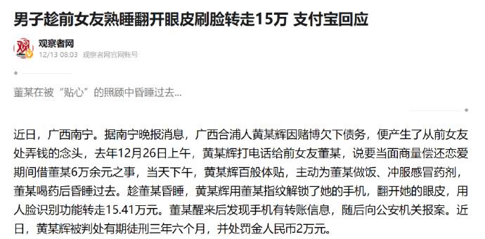 如果说,在昏睡情况下拿指纹解锁开手机、转账还有一些可操作性,那用扒开的眼皮来解锁支付级别的手机转账,听着就有点离谱了。