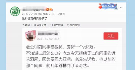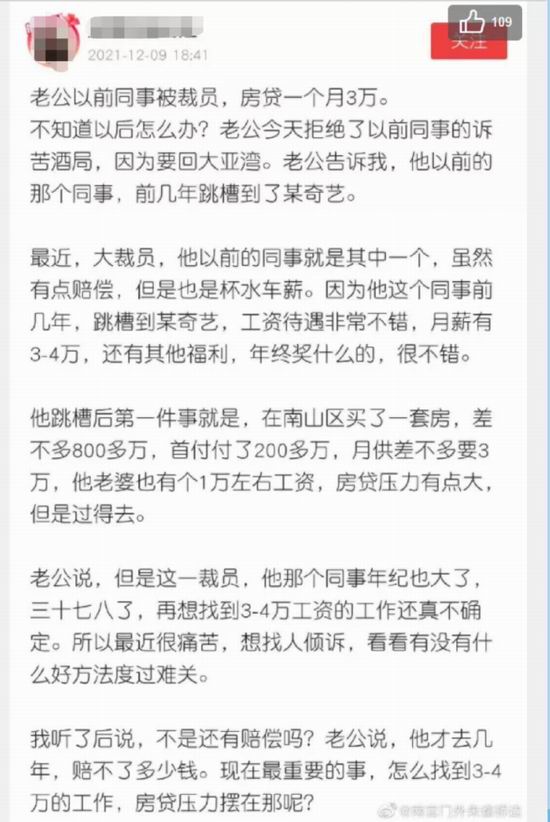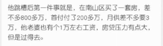 头条上有个网友吐槽,说她老公同事被裁员了,前几年买的南山区房子还贷压力很大,现在很难找工作很痛苦。