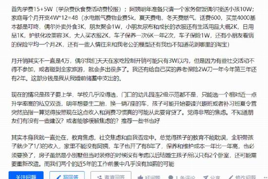 阿姨不能没有,孩子必须上私立双语,车一定要七座的,全家还要旅游,每个月出去吃饭花.3.千,朋友聚会每个月花一万…..