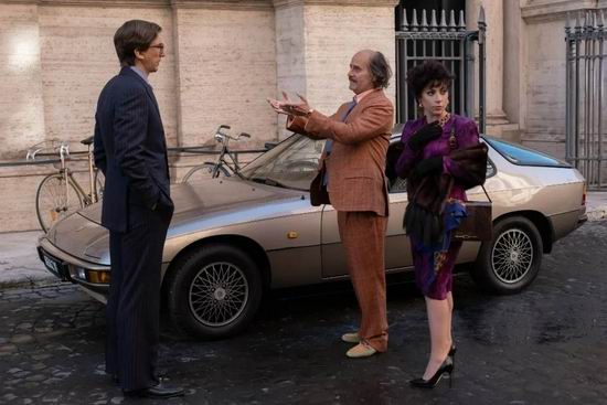 《古驰家族》剧照。片中角色(右起)帕特里齐娅和一对堂兄弟,保罗?古驰和毛里齐奥?古驰