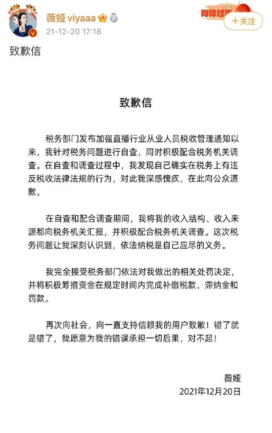 12.月.20.日,"薇娅偷税漏税事件".曝光,13.41.亿元的天价罚款,将曾经的."直播一姐".推上风口浪尖。