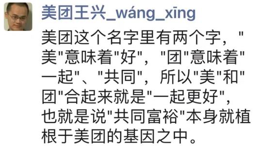 "美团这个名字里有两个字,美意味着好,团意味着一起、共同,所以美和团合起来就是'一起更好',也就是说'共同富裕'本身就植根于美团的基因之中。"