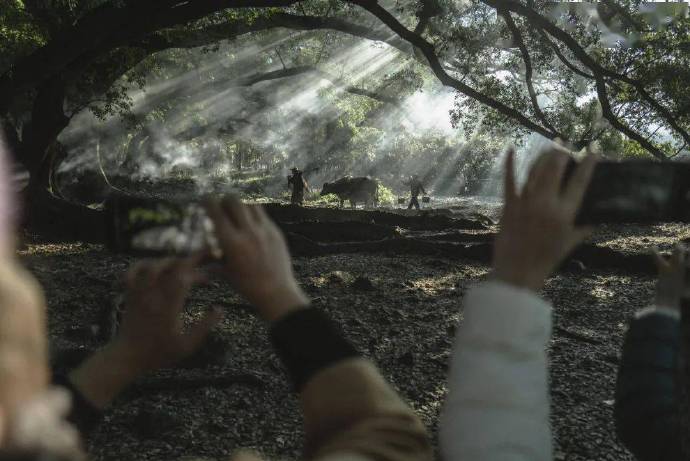 “水牛摆拍” 需要三个角色:牵牛的农夫,挑担的阿婆,以及烧烟的 —— 要复制那张获奖照片,除了农夫和牛,还需要通过烧烟复制起雾的清晨。