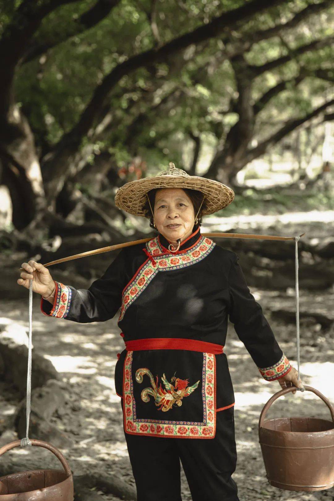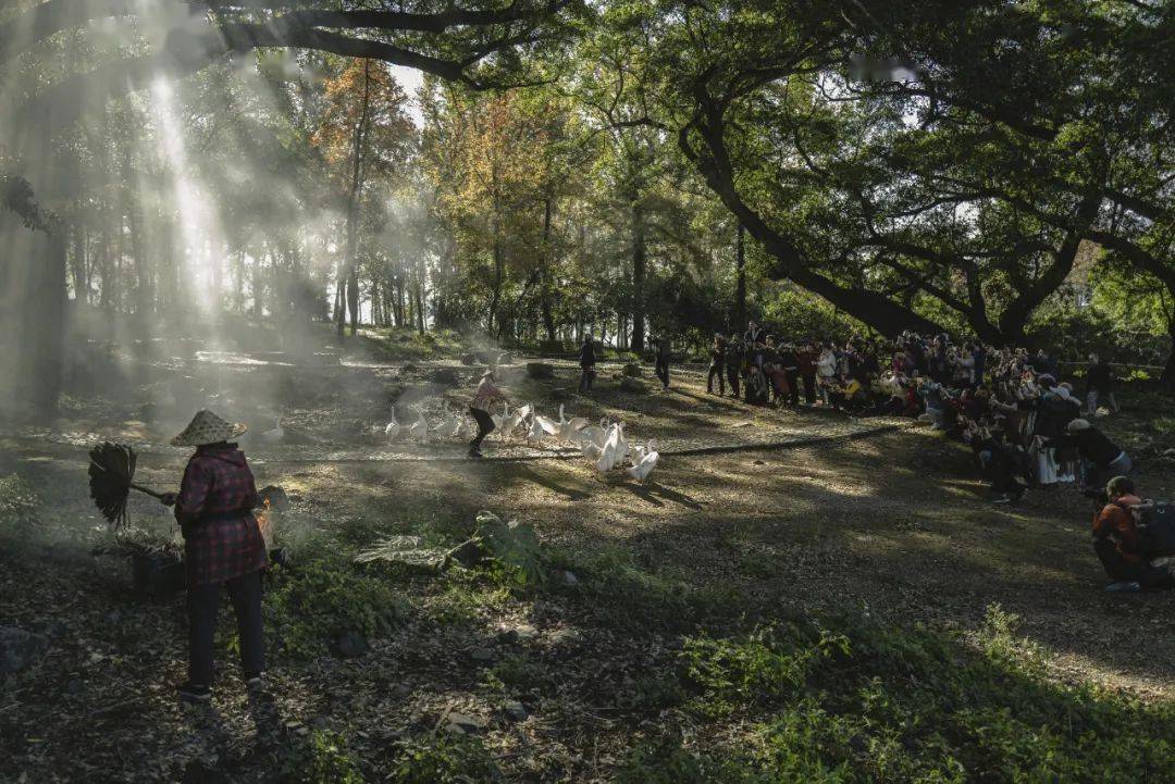 杜雪丰也是程家的媳妇,2019 年,挑担的阿婆腿摔了,同族的杜雪丰临时被拉来顶替了几天。后来阿婆的腿好了,她把工作还给阿婆后,有了一个想法。她想,既然那些城里来的摄影师喜欢拍牛,也一定喜欢拍别的动物。她想了两种动物 —— 鹅和孔雀 —— 然后跑去问郑德雄的意见,得到的回答是,“鹅吧,鹅土气一点,城里人喜欢这些土里土气的东西。”