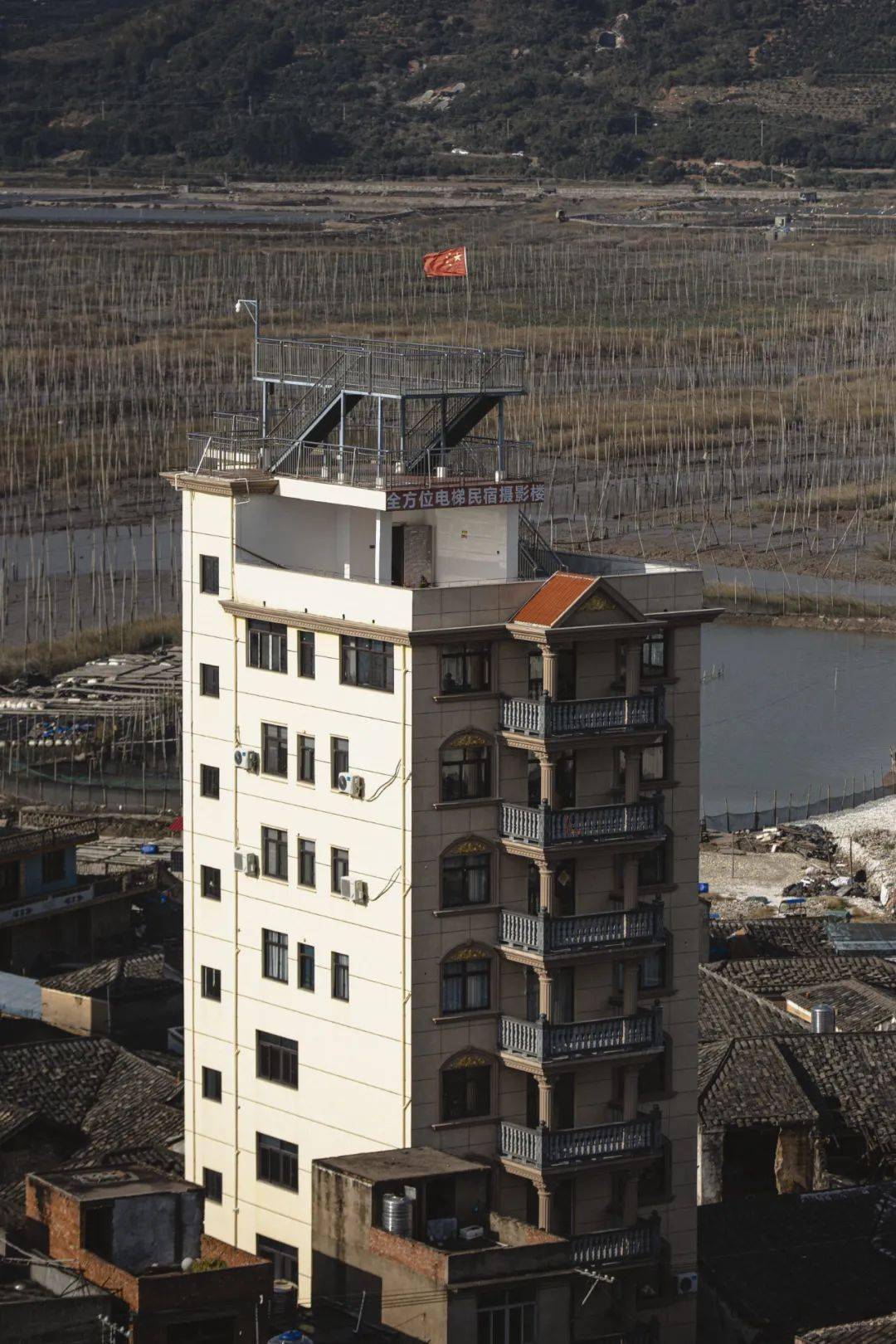 那是一栋完完全全的毛坯楼,中间几层楼至今还堆砌着建筑材料,楼梯的地板和扶手只安装了一侧的,但这丝毫不影响这栋楼成为一个地标性建筑。它唯一的作用是供人爬上七楼,站在村子里的绝对高点上,拍摄前方的 S 湾水域。而那些气喘吁吁爬上七楼的人,站在楼顶往后方望去,会看到一个更魔幻的景象 —— 还有另外一栋高楼藏在村子里,外观金碧辉煌的楼顶上拉着横幅:全方位电梯民宿摄影楼。