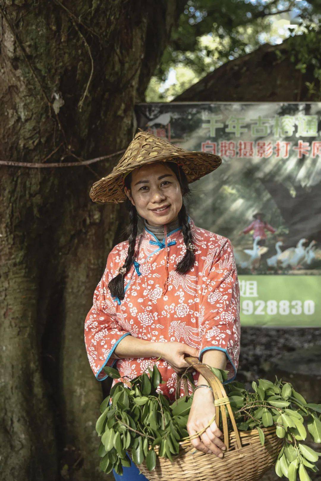 她一口气买了五只鹅,在这里开始了新事业。现在,她的形象是赶鹅姐。她给自己编了两个麻花辫,又在网上买了一些衣服,平日里她总喜欢穿那套红色的花衣服。她赶鹅的照片被印在了公园门票上,也被印成海报,挂在公园里,成为一个新的摄影项目。海报旁边紧挨着的是水牛拍摄的海报,上面写着 “杨家溪榕枫公园水牛摄影国际网红点”。