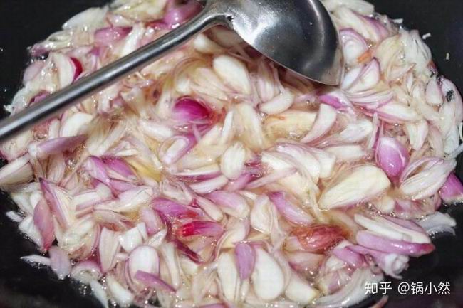 中小火,也就是炉灶最内圈是最大,外部一圈是小小火,直到放筷子刚刚起泡,倒入红葱头片,慢慢炸,才出香,用炒勺轻轻拨,切不可大火。