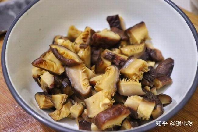 热锅,加一勺刚才炸的葱油,中火翻炒菇丁,逼出蘑菇香味,有的做法不过油就和肉一起炖,煮出来的香菇不香,甚至带有一丝霉味,就不要怪菇不行了。
