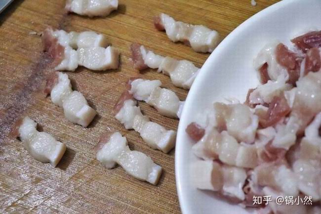切大片后再分小条,条上肥瘦皮三者都有,因为猪皮较硬,所以刀要提前磨得锋利一些,大拇指和小拇指夹住不走位,三指摁定,快刀切。