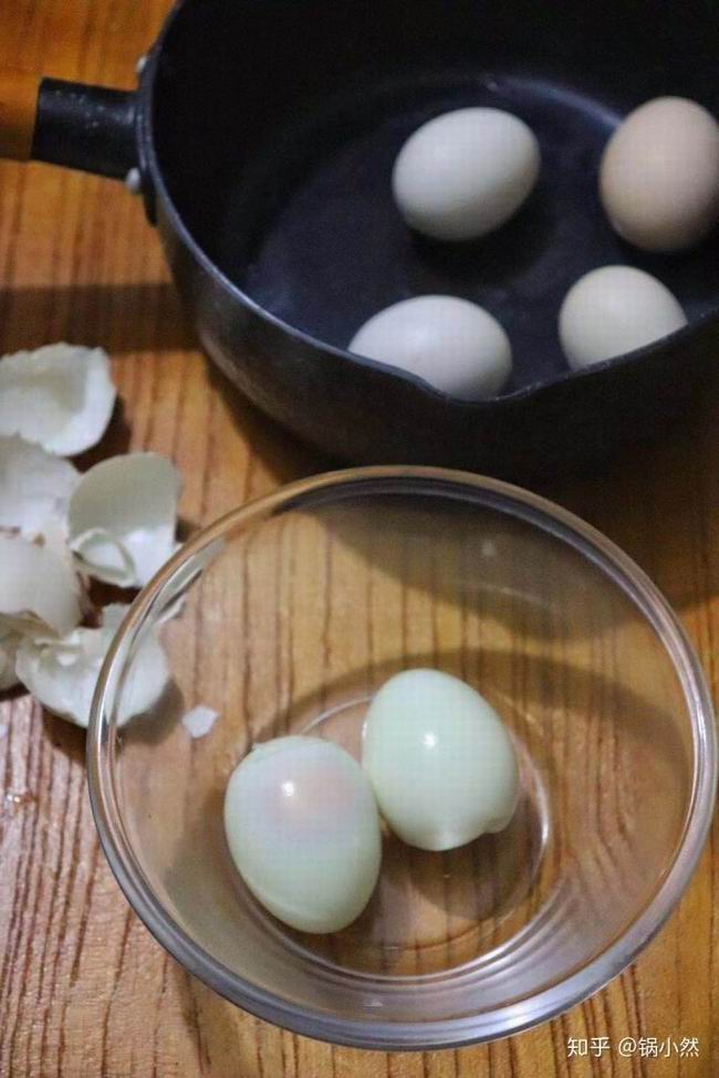 猪肉切好,鸡蛋也就煮好了,我用的是散养鸡的小颗草鸡蛋来卤,蛋黄香一点。倒去热水,加冷水泡几分钟,鸡蛋遇冷骤缩,剥壳就容易得多。