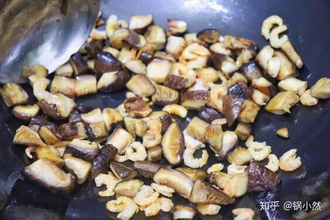 香味一出,加泡后的虾米一起快速翻炒,卤肉加虾米是为了添不同的鲜味。虾米表面过了油,出了香就同菇丁一起盛出备用。