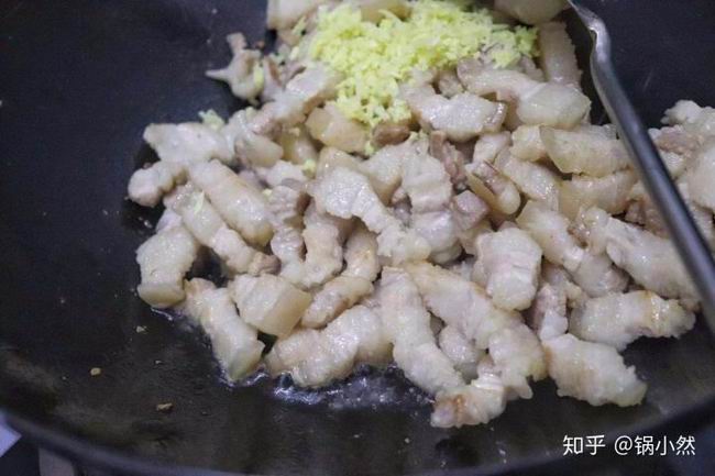 ⑩.翻动几遍后,锅底有猪油出来,倒入姜末,快速翻炒。