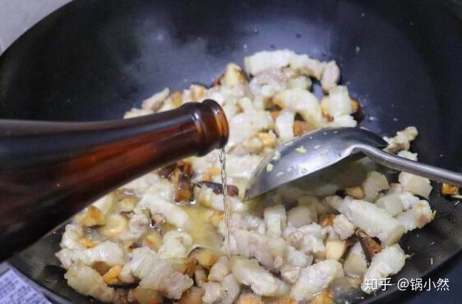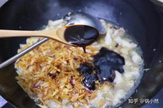 12.这时候才下葱油酥,如果是在翻炒的时候下,无水情况,葱头酥马上就会颜色加深,又会发苦,一苦的话,整锅肉都白费了。