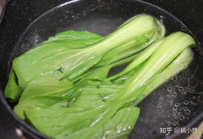 16.接近尾声了,青菜洗好,烧一锅水,加点油和盐,避免烫出的青菜发黄,水开后下青菜,不要反复翻动,煮.20.秒后翻过来煮.15.秒,这样的青菜才滑脆啊。