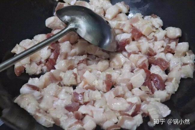 ⑨.不用加油,这五花肉本身就很肥,直接倒锅里,中火煎半分钟再晃几下翻面,不要急着用勺子炒,肉条会断。