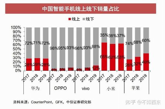 小米的手机,60% 以上都是在线上渠道卖出去的(天猫、京东、拼多多等),但是 OV 的线下占比常年在 90% 以上,线上只占一成。