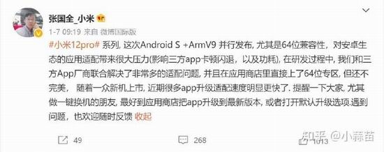 恰好,最近小米张国全发了一条微博:因为 “Android S +ArmV9 并行发布”,这个说法某种意义上和我上面提到的东西是有些类似的。