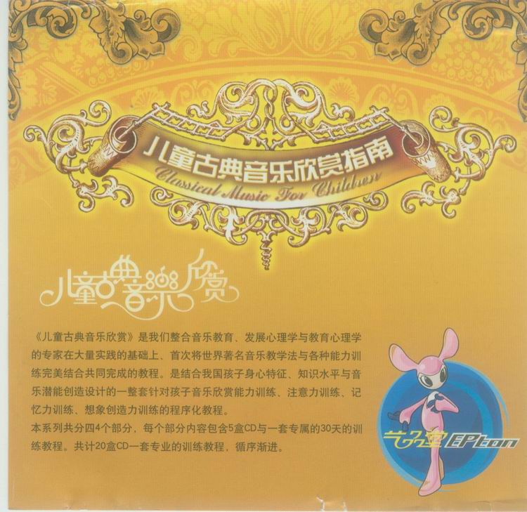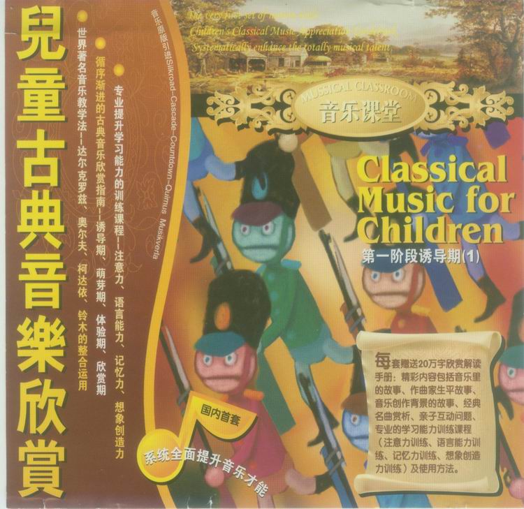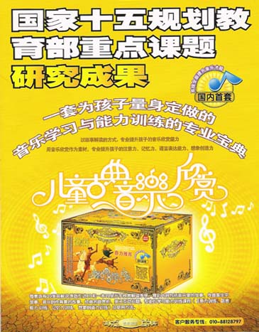 a) 本套教程获得国家十五规划教育部重点课题研究成果,是国内首套为孩子量身定做的音乐学习与能力训练的专业宝典。包含20张CD与一本20余万字的欣赏解读手册(包含:音乐里的故事、音乐创作背景故事、作曲家的故事、经典名曲赏析、针对每一首曲子应该掌握的问题以及专业的学习能力训练课程)