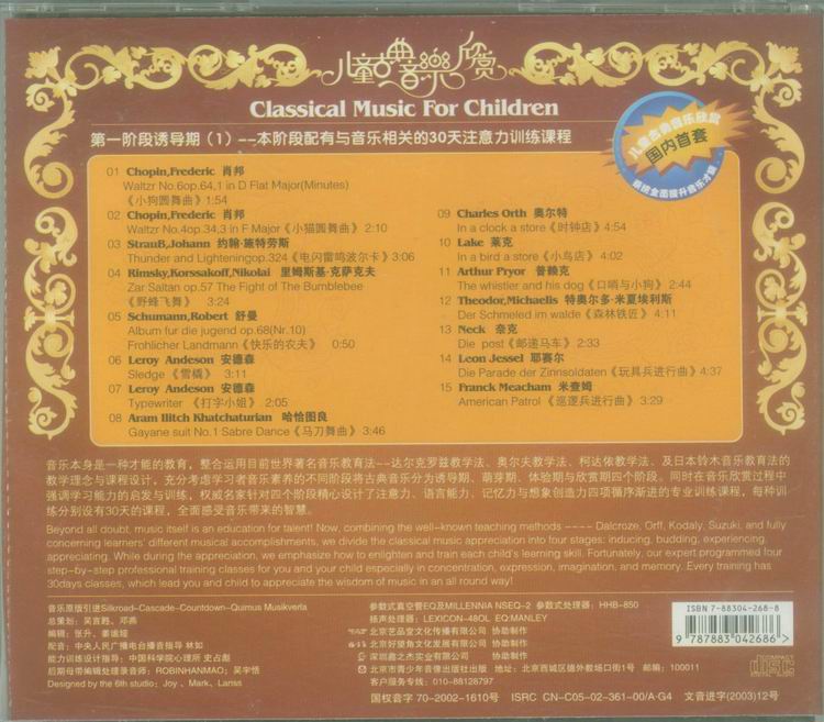 本套CD采用德国原版古典音乐,由著名播音员林如讲解,现已列入全国教育科学十五规划教育部重点课题 “ 因材施教的理论与实践研究 ” 课题成果。坚持下去,学到的不仅仅是音乐,您会发现孩子有惊人的提升