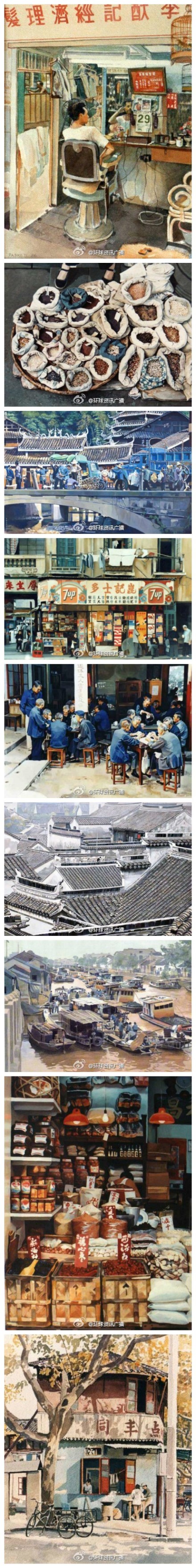 手绘八十年代的水乡中国,斑驳的水彩描出久远的记忆。出自英国皇家水彩协会主席David Paskett。