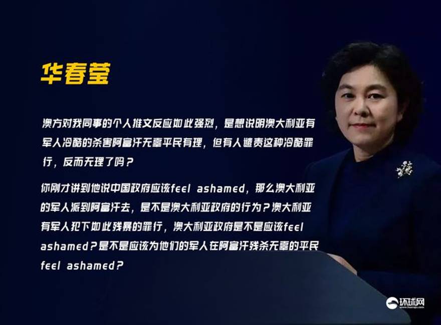 华春莹说,澳方对我同事的个人推文反应如此强烈,是想说明澳大利亚有军人冷酷的杀害阿富汗无辜平民有理,但有人谴责这种冷酷罪行,反而无理了吗?阿富汗人民的命也是命,澳大利亚政府应该做的是深刻反思,并将凶手绳之以法,向阿富汗人民作出正式的道歉,并向国际社会郑重承诺,永远不再犯这种可怕的罪行。你刚才讲到他说中国政府应该feel.ashamed,那么澳大利亚的军人派到阿富汗去,是不是澳大利亚政府的行为?澳大利亚有军人犯下如此残暴的罪行,澳大利亚政府是不是应该feel.ashamed?是不是应该为他们的军人在阿富汗残杀无辜的平民feel.ashamed?